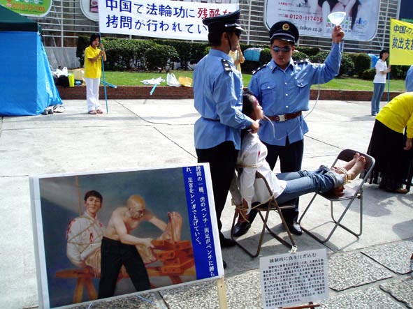![]() 金子容子在向民众说明自己所遭受的“死人床”酷刑 | ![]() 真人演示的“死人床”酷刑 | ![]() 日本学员在向民众介绍“死人床”酷刑 |