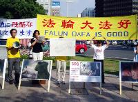 为了参加这次反酷刑真人模拟展,日本大法弟子克服困难,从各地赶到名古屋,在两天的反酷刑展中,向广大的当地民众讲述了在中国发生的对法轮功的迫害。两位日本大法弟子不间断的用扬声器向路人讲解着在中国发生的对大法弟子的种种酷刑和大法真象。