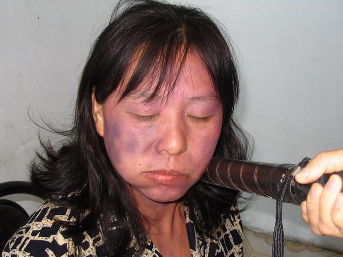 一天,恶警为了逼我屈服,让我读诽谤大法的书,我不读,管教让我举着书罚站,连续三天,每次都在两个多小时以上。胳膊疼得都抽筋了,我死也不念。第四天,恶警大队长张桂梅把我叫到办公室,问我为什么不念,我说有我师父的名字,诽谤我师父我就不念。然后,她拿起两根电棍同时电我,一根放在脸上不拿下来,另一根电我全身,一边电一边恐吓:睁开眼睛看火。当时电得我眼睛已经睁不开了,嘴电得直淌口水,就这样电了一上午,我没有向邪恶妥协。她害怕了用电棍狠狠的打了几下,说:快滚!当时,电出的大泡被打破,浓水淌在衣服上,当我走出办公室时,脸已经被烧焦了、变了形、肿得很高、眼睛肿成一条缝,很多学员看到我都吓哭了。晚上全身和脸疼得象火烧一样,不能入睡。只好坐起来用手抚着脸,象这样电棍电击我不知有多少次。