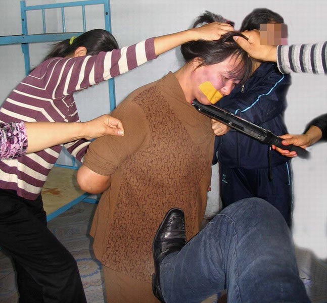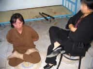2000年12月,我们几个不屈服的大法弟子被分到一个监室,为了逼我们屈服,恶警往监室的墙上贴满了谩骂李洪志师父的标语,我们上前阻止和它们讲道理。大队长和管教蜂拥而上,把我们几个拖到办公室,管理科的人都来了,恶警大队长关威和管教王晶等四五个恶警把我一顿毒打。边打边用电棍电我好长时间,她们不准我们说话,用胶布把嘴糊住,然后把我们几个双手背扣,写谩骂李洪志师父的标语贴了我们一身。白山学员吴秀芹被带到办公室,看到此景迅速的撕下我们身上的条子,恶警把她用手扣背扣到床上,一男恶警用电棍电。这样,折磨了我们一下午。然后让我回监室,把吴秀芹和何华关進小号,一关就是将近一个月。第二天我撕了一张邪恶标语,她们把我吊在小号的门上十多个小时,不让上厕所。晚上放开时,我的手和胳膊肿得吓人,两手攥不上拳头,疼得不敢动,就这样还逼我干活。