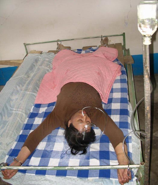 2001年底,为了抗议劳教所执法犯法、乱用刑罚,随意加期等绝食抗议,劳教所迫害性灌食,把我折腾得死去活来后,第十天也就是2001年12月9日把我送到吉林省公安医院。到了公安医院恶警管教把我用手扣、脚扣锁在了床上,躺在那一动也不能动。然后拿了很粗的胶皮管给我下胃管,因管子太粗,下了几次也下不進去,我咳嗽得喘不出气来,管教不管我死活,硬往我鼻子里插,这样折腾了很长时间,把胃管下上了,当时我满身是汗,已经是有气无力了,它们说接着来,然后给我下尿管,疼得我浑身哆嗦,又喘不出气来,痛苦至极,死亡只在一息之间,就这样它们把我扔到床上,打上点滴,管教大吼,谁也不准管她,到这里没有人护理,导尿管漏了,它们不给重下,只能湿着,当时同室有两个刑事犯人、一名法轮功学员,那个学员见我褥子湿了,就给我腰下垫了一个痰盂、一宿下来、腰象折了一样,痛得无法忍受,当天晚上我总是往上涌痰,我被锁着无法自理,有时痰吐不出来,憋得我就要窒息,同室的法轮功学员不忍心,偷偷的起来给我抠痰,照看了我一宿。第二天就走了,管教说:她走了,看谁管你,它们插上胃管,也不给灌食(四天只灌了一次,弟弟买的奶粉和桔子汁)也一直不给拨下,就是让你难受。我的嗓子全肿了,不断的咳嗽,因没人护理,我又被死死的扣在床上,咳嗽吐痰时只能歪一歪头、脸上、身上到处都是,导尿管漏了,洒在地上,刑事犯人就用我的棉裤擦地,白天她们嫌我脏,到别的室去,把窗户打开,当时是12月。北方的寒冬季节,我只穿了内衣内裤,身下是湿的,身上的被只盖到胸,我动不了,疼痛、寒冷、责骂、污辱交织在一起,每天承受的痛苦是巨大的。它们强行给我打点滴,每次都是扎完针就不管了,我只好求本室的一个刑事犯人给拔针。有时滚针了,也没人管,点在肌肉里、腿和脚肿得很粗,疼痛难忍。第三天点滴完没有拔针,我也没再求她们,我看着空空的点滴瓶,慢慢的闭上了眼睛(医学常识,点滴空瓶,气能致人死亡)。我迷迷糊糊的好象睡着了,不知多时睁开了眼睛,看见空瓶还挂着,生命还在。在公安医院仅仅四天的经历,使我深深体验到:所谓的公安医院根本就不是治病救人,而是加重迫害。