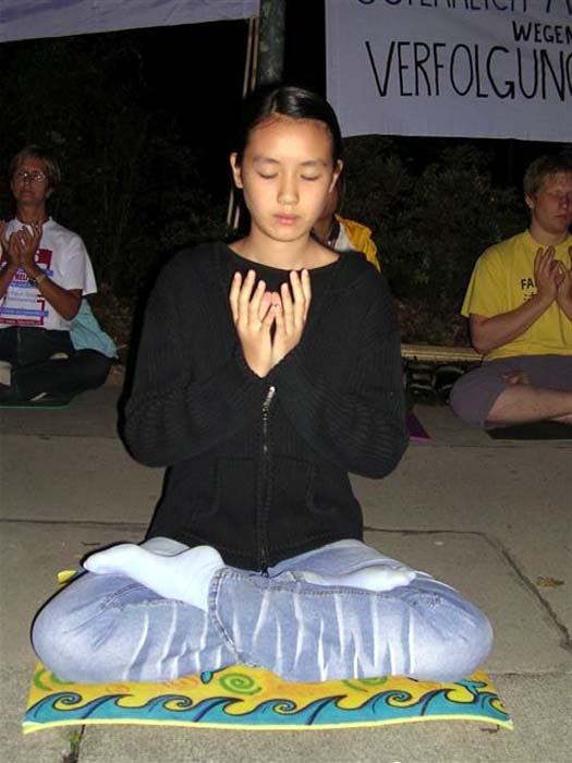 2004年9月1日晚,法轮功学员们在中国驻奥使馆前举行了烛光守夜,谴责贾庆林等参与的残酷迫害,呼吁立即停止迫害。