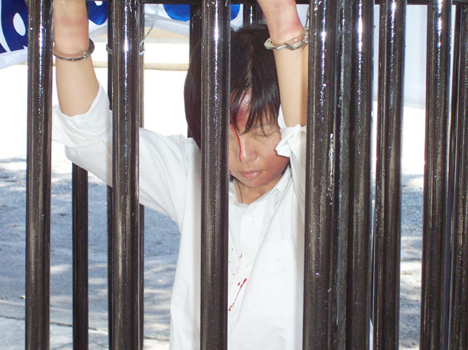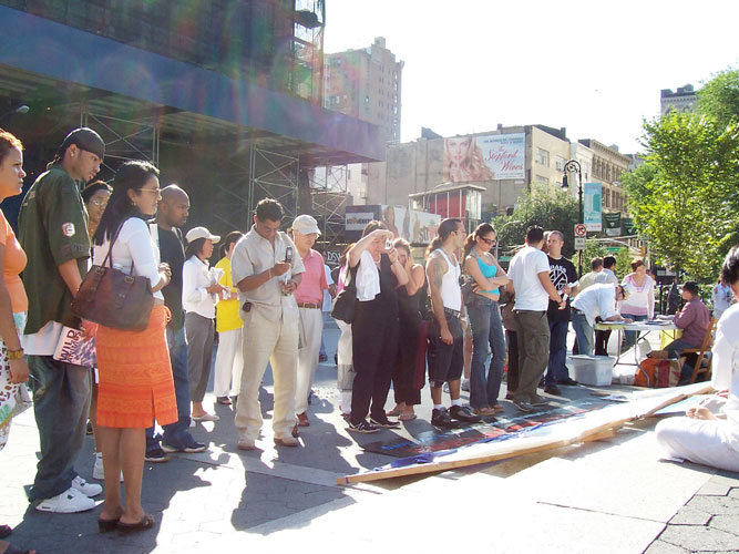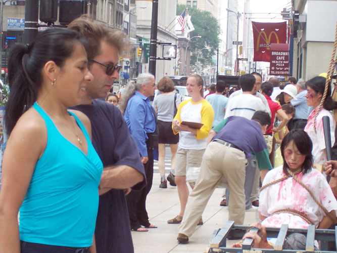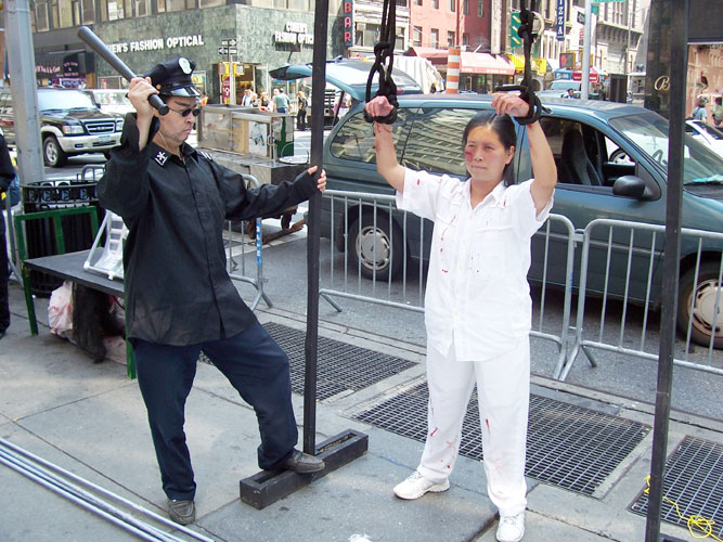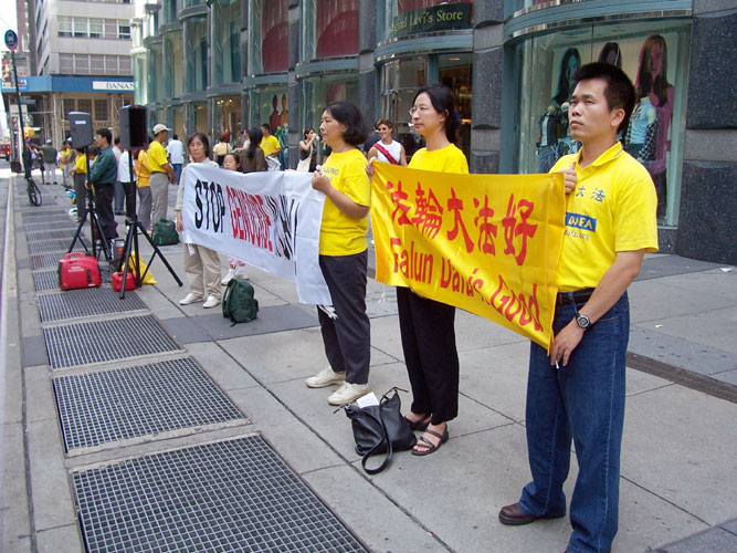 美联社在9月1日的报道中说,十几名法轮功学员在联合广场(Union Square)身穿带有血迹的衣服演示酷刑。华盛顿广场新闻8月30日在报道中也报道了法轮功学员的活动,报道提到一群法轮功学员在联合广场进行请愿活动。