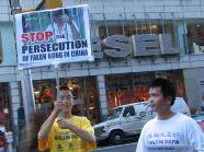 在共和党大会的前一天,我一个人举着展板走在60街第五大道附近的一个街区。沿途,很多专车、司机等在路边,有的象是记者和其他什么工作人员。我路过的时候很多人都注意的看我手中的展板,有的人还拿了传单。我开朗的谢谢拿传单的人,他们和他们周围的同伴也都露出愉快的神色。其中,三名上层社会的青年男子,看到我手中的反酷刑展板时停止了交谈,等我路过他们身边时,其中一个人不动声色的问:怎么回事?我简明的说出法轮功是什么、92年传出受欢迎、99年大面积遭迫害、谁因为什么发动迫害、炼法轮功的人们为什么受迫害也不愿意撒谎的情况。对方显然思维敏捷,理解力也很强,当我讲到99年以来5年中至少上千人因为不肯放弃修炼法轮功而被迫害致死这一句时,他严肃的说:我会为你们祈祷。我微微一笑,郑重的说了声“谢谢”,转身继续走路。
