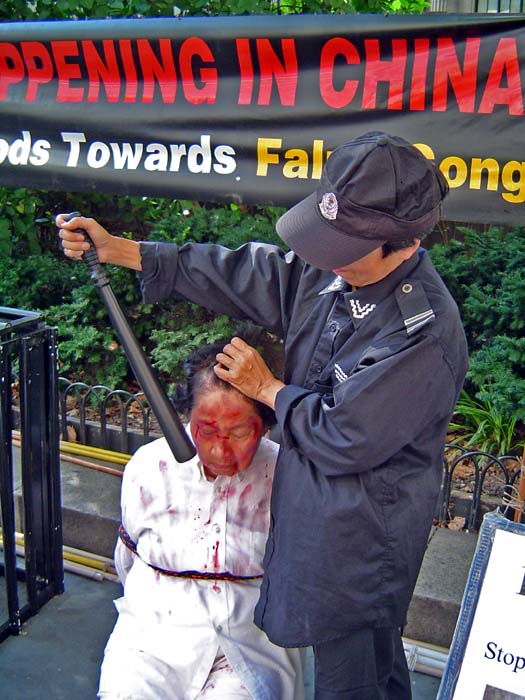 ![]() 这位77岁的新泽西学员说:“你用慈悲的眼神看着他们的眼睛,他们都会接的。” | ![]() 酷刑展示在曼哈顿街头 |
