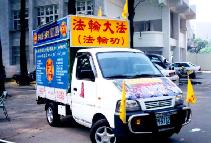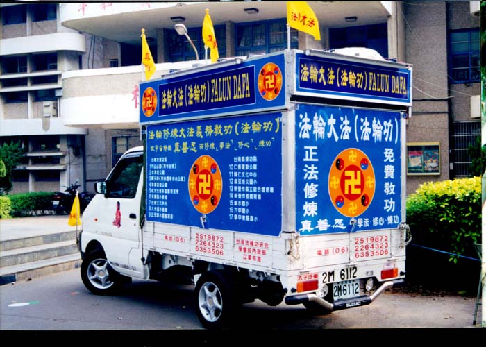 台南法轮功学员利用每个假日,到乡下或社区洪法,或互相邀约到著名景点洪法炼功、发资料、讲清真象,也常参加各种功法表演活动,获得民众欢迎,很多人因而得以喜闻大法。早期就有做广告的学员,利用承包公车车厢广告多出来的版面,刊登醒目的法轮大法的广告,洪法效果很好,又有退休学员将自家车子改装成洪法车,每天穿梭大街小巷,沿路播放录音广播,告知民众法到人间,珍惜修炼的机缘。