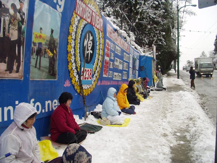 【明慧网2005年1月10日】(明慧记者李华温哥华报道)2005年1月8日下午,加拿大温哥华大雪纷飞,法轮功学员仍然冒着大雪,坚持在中领馆前发正念、炼功,过往车辆不断按喇叭致意,有的还专门停下车来摄下这珍贵的镜头。