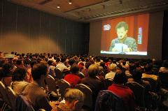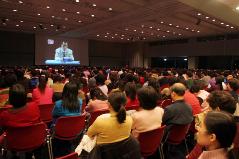 【明慧网2005年1月10日】2005年1月9日,台湾法轮大法修炼心得交流会在台北国际会议中心隆重召开。参加此次交流会的达六千多人,学员来自台湾全省及北美、日本、马来西亚等世界各地。法会现场庄严温馨,师父的法像高挂中央,大厅两侧是长达数米的大横幅:“大法圆容乾坤正 法王慈悲造大穹”,讲台上一排美丽晶莹的莲灯,代表千千万万大法弟子像金子一般坚定的心。