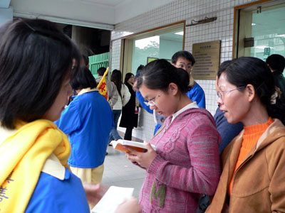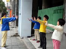 有一位大姐姐甚至当场就和妈妈学炼起功法来,而且妈妈还将《转法轮》拿给她看,她表示回去要去书局买书,要到炼功点学功。看到这么多有缘人要来认识法轮大法,我好开心,所以我和几位小弟子也在诊所前开始炼功,希望大家都能认识功法的美好,不要再花那么多时间去看医生了,请跟我们一起炼法轮功吧!