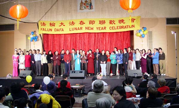 晚会一开始就是热闹的舞狮表演,接下来莲花艺术团的少女们展示了优美的舞蹈,明慧学校的小弟子们还做了法轮功功法表演,天真可爱的孩子们,优美祥和的功法赢得了人们阵阵热烈的掌声。晚会上还播放了2004年法轮功十大新闻回顾,其中包括全球起诉江泽民。