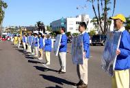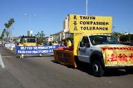 最近一段时间南加州天气异常,连天阴雨,可是游行的前几天,天气突然好起来,游行的当天更是晴空万里。法轮大法的队伍由两个横幅、一个花车、一组反酷刑展和一个展牌方阵组成。走在队伍最前面的是由三个学员展开的横幅,“法轮大法”几个字在阳光下熠熠生辉。接下来是法轮大法功法演示花车,五名学员在花车上表演功法,动作舒缓优雅,引来观众衷心的赞叹。