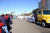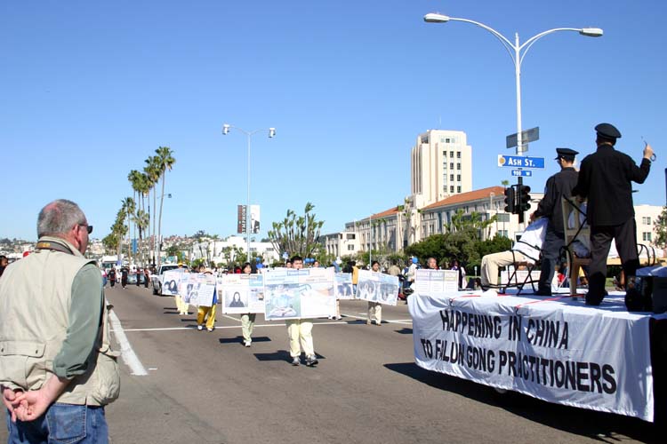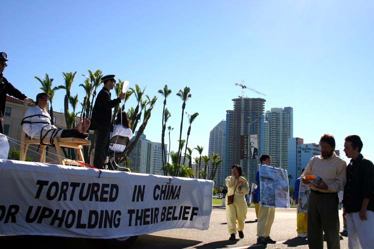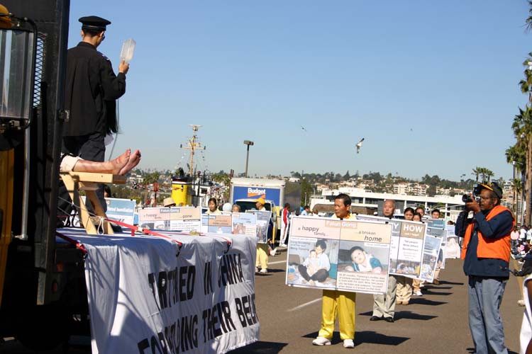 花车后面是四位学员展开的横幅“请帮助制止在中国发生的对法轮功的迫害”。随后的卡车上有三组酷刑演示:蹲小号、老虎凳和野蛮灌食。展车后面是展牌方阵。学员表情庄严肃穆,展牌上展示的是迫害发生前后法轮功的真实故事:大法洪传、学者日众,学员普遍身心受益、道德回升;1999年中共发动对“真、善、忍”的迫害,使无数修炼人备受摧残、家破人亡。