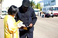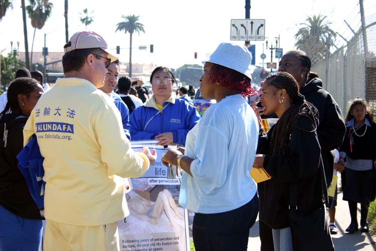 人们纷纷索要传单。人们不解的问:“为什么?”“为什么要迫害这群好人?”“我们怎么才能帮助你们?”一个西班牙语媒体的记者从始至终跟随着我们的队伍,不断拍照并问学员问题,最后表示要学功。一位黑人男士说,这些学员遭到的迫害比黑人历史上遭到的迫害严重无数倍。一个黑人小女孩一直跟在酷刑展车的后面,目不转睛的盯着几组展览。一名观众说,“你们做得对!就应该把邪恶揭露出来。”另一名观众说要帮助我们联系人权团体。