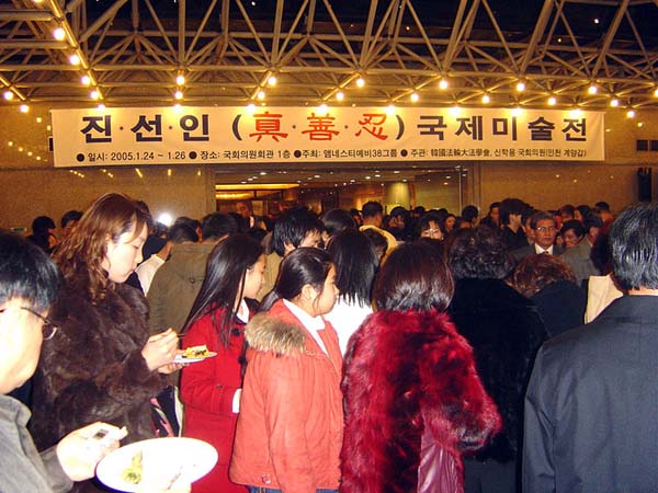 在“坚忍不屈的精神”世界美术展进行得如火如荼的2004年11月初,韩国法轮功学员就中共江氏集团侵犯人权的问题向国会议员讲了真象,并介绍了美术展。最后,韩国法轮大法学会与辛鹤用国会议员(仁川桂阳甲区)共同在大韩民国的立法部门──国会,举行了美术展。