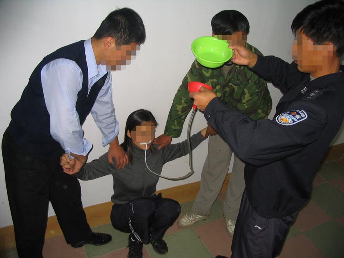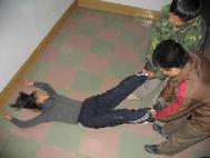2001年1月18日张卜元在北京天安门展开大法横幅,喊出“法轮大法好”后被两名保安押入依维柯车,送到前门分局,后转入北京丰台区玄武拘留所。在绝食抗议时遭野蛮灌食。(图2)由两名男刑事犯按住肩膀,蹲靠于墙角,一名男狱医下鼻管,在鼻管插到气管晕厥的情况下(图3)由两名男刑事犯拖着两腿扔到一边,醒来后继续下鼻管灌食,鼻管拿出时带血。