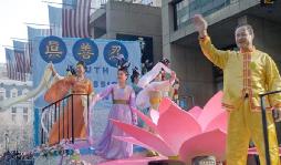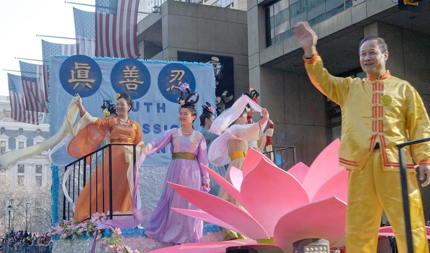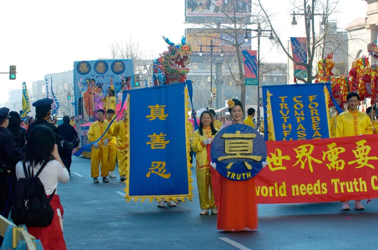 游行队伍从百老街(BROADST)开始,一直延续到费城市政大楼,沿街布满了热烈欢呼的观众。游行中,特别引人瞩目的是以“真善忍”为主题的法轮功学员组成的游行队伍。他们是参加这次游行的唯一的华人团体,法轮功学员表演的舞龙、天女散花、扇子舞和法轮功功法演示,赢得观众热烈的掌声,人们高兴的喊“Bravo!”(太棒了!好极了!),向法轮功学员挥手致意,感谢他们把中国的传统文化和“真善忍”的福音带给西方社会。