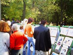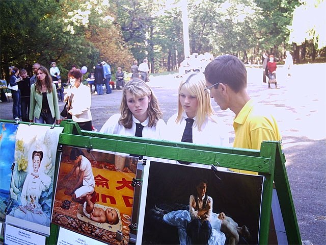 【明慧网2005年10月1日】2005年9月25日,乌克兰克拉玛朵儿斯克和斯拉夫斯克市的法轮功学员参加了汽车工人节,并向人们介绍法轮大法。同时展出的功法介绍图片和在中国法轮大法弟子无辜受迫害的图片吸引了众多世人。