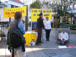 在反酷刑展现场,除模拟演示外,两名学员还以扩声器向人们介绍发生在中国的迫害,以使路人能了解中共如何残暴的迫害信仰“真、善、忍”的善良民众。学员邀请斯塔瓦格市居民在两份请愿书上签名,一份是要求制止中共对法轮功的迫害,另一份则是呼吁救援在中国的法轮功孤儿,由于双亲或父母亲中一方因修炼法轮功而被迫害致死,这些孩子沦落艰难的处境。许多了解了真象的人们都签名表示对法轮功及法轮功孤儿的关心和支持。