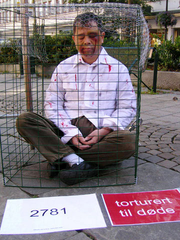 另一项模拟演示的酷刑是“关笼子”,通常笼子很小,以致关在里面的学员无法坐直或伸展双腿,通常被关在笼子里后,都是无吃、无喝,而且不准上厕所,非常痛苦。