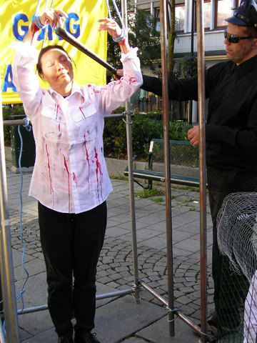 模拟演示的酷刑之一为“吊刑”。这个行刑方式非常残酷,也被大规模使用。中共警察把学员双手用细绳绑住吊起,一吊几小时或几天。有的细绳崩断,有的勒入肉中,学员当场昏死过去。还有更多用手铐吊起,铐断筋骨。这种酷刑轻者手臂长时间不能活动,重者终身残废。