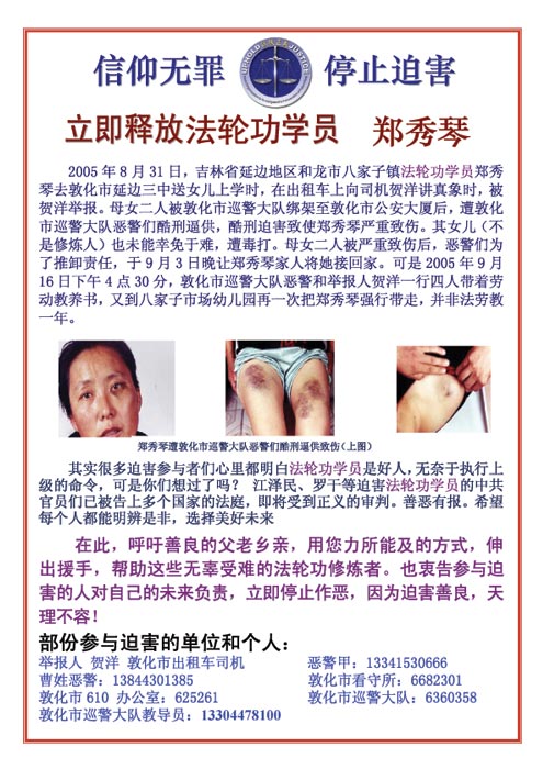 不干胶:立即释放法轮功学员郑秀琴(吉林省延边)