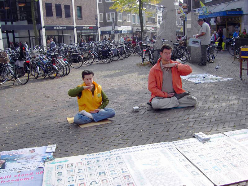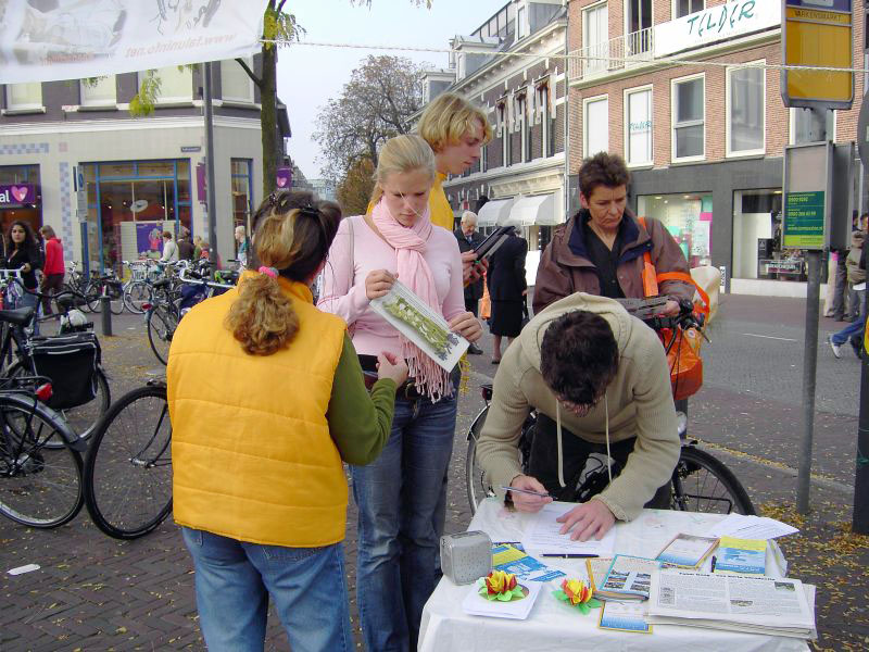 和阿姆斯特丹相比较,这是一个保守的城市。很多人对法轮功和这场迫害不太了解。路过展位时,有的人被功法演示吸引,有的人被真象图片吸引。他们在阅读,在思考。我和同修给他们讲完真象后,很多人马上签名声援诉江案,有的人索取报纸,表示進一步了解后再做决定。还有一位有华裔血统的女士对学功感兴趣,她特地索取了法轮功学员的联系方式。