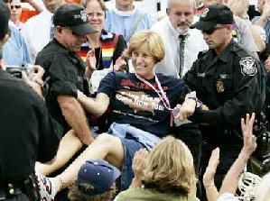 正好我找到了“反战母亲”被警察“逮捕”的照片,她居然面带笑容,警察把她高高抬起。“逮捕”的理由是警方以法律规定示威者不得在中途停止逗留,发出三次警告后而实施的。对比法轮功学员在天安门广场被施暴的情形,真是很有讽刺性。我已并把下面的两张照片寄给了朋友,他会作何感想呢?