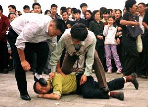 警察在天安门广场对法轮功学员施暴 (图片)