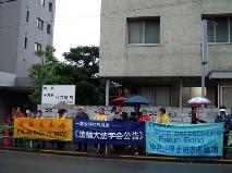 上午11时许开始,学员们冒雨到中使馆对面的人行道,打出要求停止迫害法轮功的横幅,日本法轮大法学会代表卢敏和佐藤国男分别用中、日文宣读法轮大法学会公告,正告那些曾参与中共对法轮功迫害的人,抓紧时机弃恶从善,立即停止迫害,以免在对邪恶的最终审判时,断送自己美好的未来。