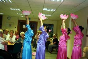 一位学员首先介绍了为什么莲花在中国受到人们的特别的喜爱,是因为她“出淤泥而不染,濯清涟而不妖”,虽然身处恶劣的环境,却不同流合污,保持清纯、圣洁,这象征了法轮功学员在目前的残酷迫害下,仍然坚定信念,坚修大法的不屈的精神和意志。然后学员给观众表演了莲花舞,曼妙的舞蹈、美丽的莲花博得了热烈的掌声。