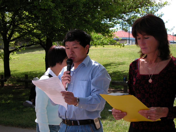 宣读公告后,两名法轮功学员来到中使馆大门前按铃,希望将公告递交给中国驻澳大使,但使馆内无人回答。法轮功学员们希望高墙内的同胞能清楚的知道,天灭中共是历史的必然,神必将清算对大法行恶者。在这种情况下,如果有人不悬崖勒马,继续执行江氏流氓集团的镇压政策,就是罪不容恕,定将受到严惩。