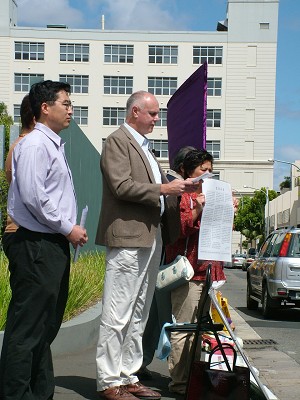 公告宣读完毕后,纽省法轮大法佛学会代表瑞贝卡和约翰·戴乐進中领馆递交中英文公告,接待员刚开始让他们俩在一旁等着,并用电话通知使馆里面的工作人员,过了大约一刻钟,接待员告诉没有领事接信,瑞贝卡表示他们将通过传真或者邮寄的方式再次递交中英文公告。