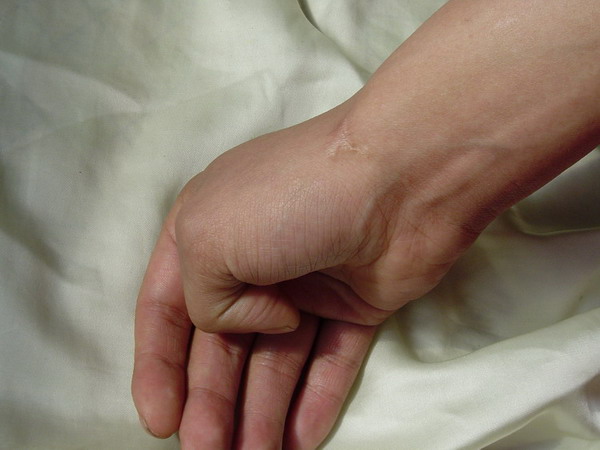 大概过了四、五个小时,雷明的胳膊,手腕骨被抻的、硌的如同被刚扣上一样痛苦,汗水好象流干了似的,身上的衣服早已湿透。雷明的手腕还在用力往上拽,终于牛皮带被雷明挣断了。恶警们想再扣上,可是怎么也扣不上,一个恶警抓住雷明反背铐的双手,使劲往上抬,使雷明的前胸和大腿紧贴在一起,雷明小腹被铁棍硌的十分痛苦,这个姿势大约过了五分钟才停手。这时恶警们又找来一根绳,准备用绳子固定他,但是怎么也固定不紧,没有别的办法,只好把手铐打开往扶手上的手铐上铐。由于双手被强力拉抻,雷明右胳膊已经脱节了,右小臂呈紫黑色,象残废了一样悠荡着,双手肿的象馒头一样,手指粗了二、三倍。