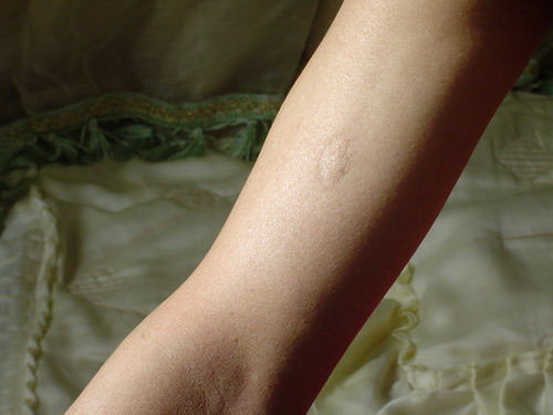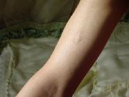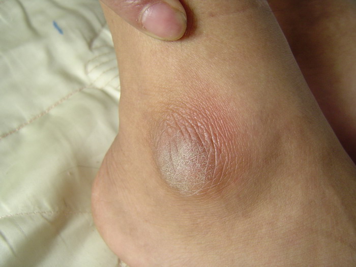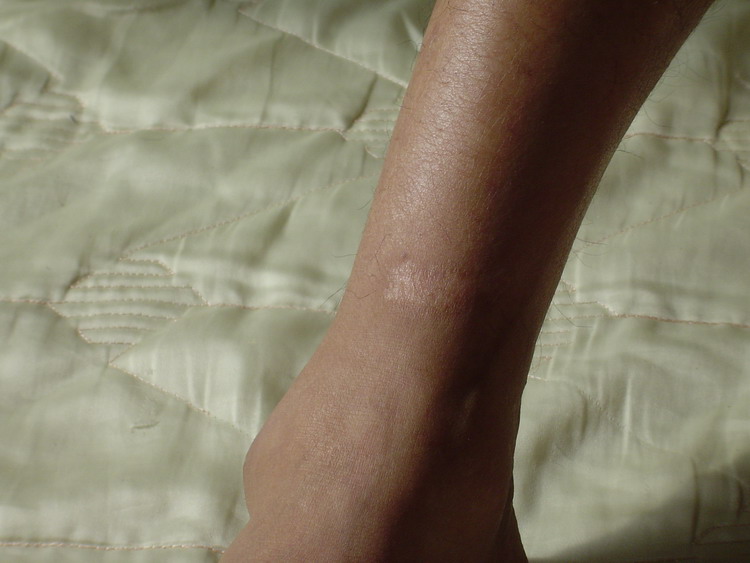![]() 雷明在吉林监狱被长期强制坐板后造成的臀部肌肉坏死结痂 | ![]() 雷明脚踝在吉林监狱被迫害后留下的伤痕 |