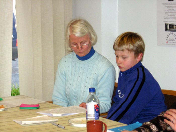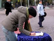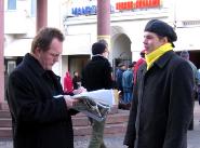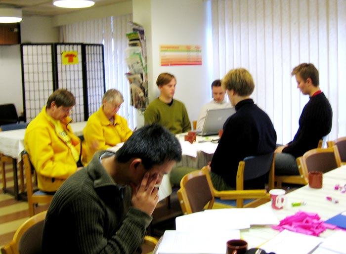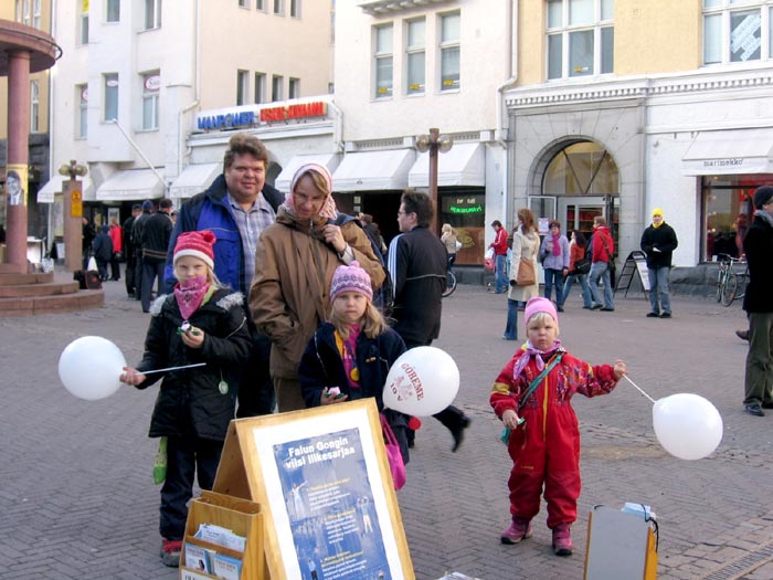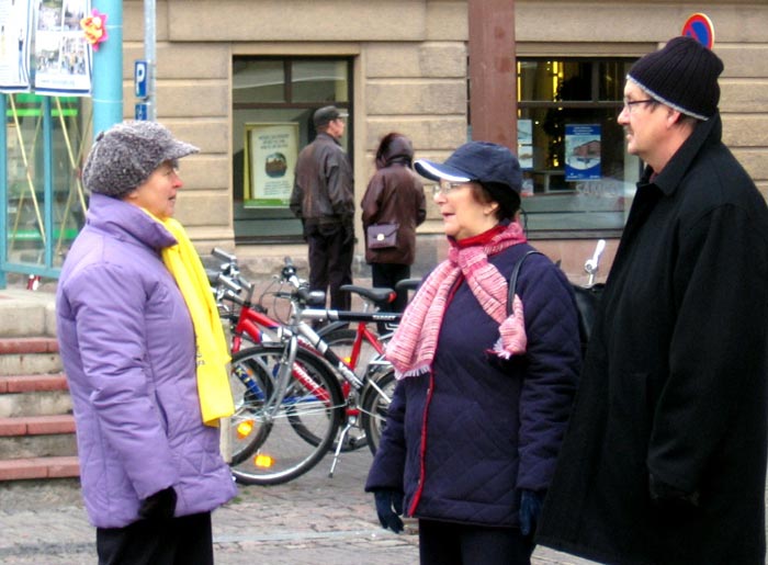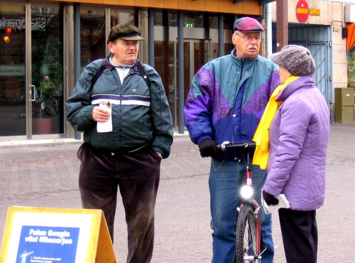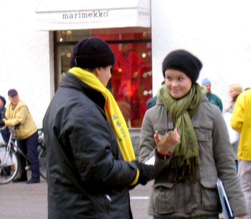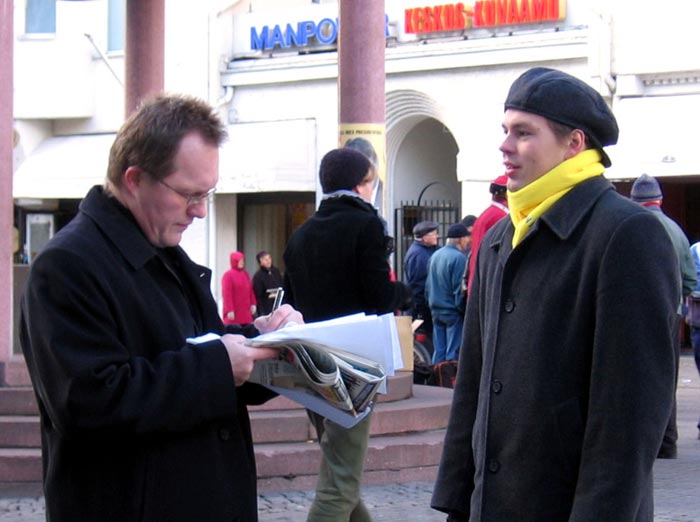 西人学员米高(Mikko)在活动广场巧遇为竞选总统在此活动的Timo Soini先生,米高插空儿上前问:“先生,三年前我见过您,曾给过您法轮功的资料,您还记得我吗?”Timo回答:“记得,你叫米高。”米高非常惊奇Timo如此好的记忆力,并立即送他一本自己随身带的英文版《九评共产党》,Timo高兴的接纳了。