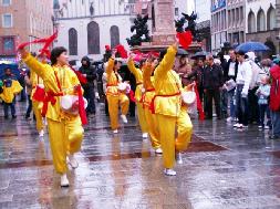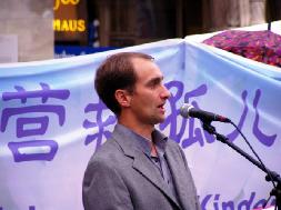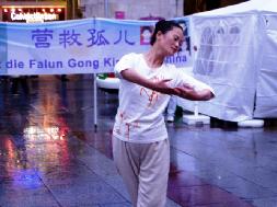 这场残酷镇压已经持续了六年多,但血腥的迫害从未停止过,由于中共封锁新闻,使人们无法得知这场迫害的真实情况。为了让德国民众了解真象,引起社会各界的反响,帮助那些孩子们,尽早结束在中国发生的人间悲剧,德国法轮功学员举办了这场露天的义演,很多观众通过义演了解到在中国大陆发生的对法轮功迫害,他们签名支持法轮功学员,有的观众对学员说,表演太美好了,有的希望迫害早日结束,还有的观众将雨伞送给站在雨中的法轮功学员。