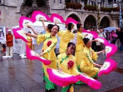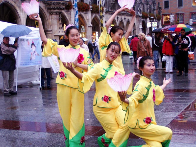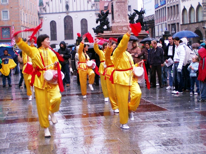 时逢慕尼黑啤酒节,玛琳广场挤满了来自世界各地的游客。尽管整个下午慕尼黑被阴雨侵扰,演出依然照常進行,人们兴致高涨,丝毫不受天气影响,精彩的表演赢得了热心观众的阵阵掌声,他们也渴望了解那些在中国遭受迫害的法轮功青少年儿童的情况。