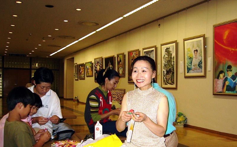 有些人是拿到广告来观看画展的,而且还来不止一次。特别是有一位85岁的老人,耳不聋眼不花,第一次和夫人一起来观看画展,看完后拿了真象材料回去了,第二天又来看画,还认真听学员讲真象,留言表示在中国发生着这么残酷的事情不可思议。他为法轮功学员加油,并表示:你们要为早日停止这迫害而努力啊。他还回家给学员拿来日本的点心表示支持和鼓励。第三天他又来看画。看完后对学员说,明天他要去住别的县的哥哥家,他的兄长虽87岁可是很健康,还能跳舞,有二百多学生。这次他要拿一些真象材料和小莲花,给他的兄长和他的学生,让他们也了解在中国发生的对法轮功学员的迫害。学员们都为这位老人的善良愿望而高兴。