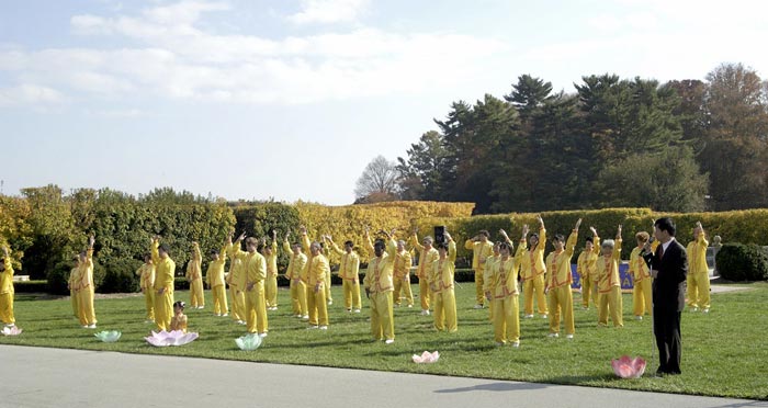 在菊花展馆前、主喷泉公园旁,来自费城、南泽西、特拉华地区的法轮功学员为游客们,表演了两场中国传统的腰鼓和法轮功功法。天气出奇的好,在环境优美的花园里,伴着中国传统的音乐,观众都沉浸在法轮功祥和、宁静的功法展示中。一直在静静的观看法轮功表演的Mary说:“表演得棒极了!很美。”有很多人在模仿着学炼功动作。
