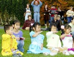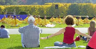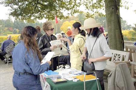 负责法轮功信息展位的杨女士说:“当我们的功法演示一结束,游人一下围了上来要资料,买书、买CD、买教功带想学炼法轮功。只觉得应接不暇。看到这么多渴望得法、了解真象的人们,我很感动。”