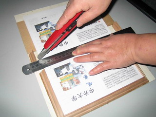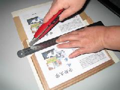 我们发现在制作厚书(包括《转法轮》)的过程中,用双面胶粘好书皮后,由于书皮较厚,书的第一页和最后一页很容易被撕带下来。我们的方法是:用A4规格的塑封膜(厚度为7S),将其裁成1厘米宽的长条(一分两开,一层即可),用固体胶轻轻粘在要装订的一侧,正反面都粘(注意固体胶只是稍微将塑封条固定在纸上,便于装订)。然后用装订机订好。粘书皮时,把双面胶粘在塑封条上,这样书皮就不会把书页撕带下来了。(如图):