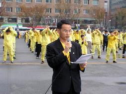 游行之前在釜山站前韩国法轮功学员发表声明,呼吁中共停止迫害法轮功