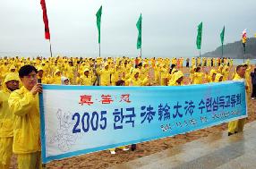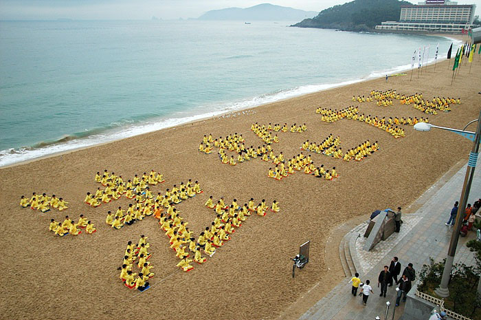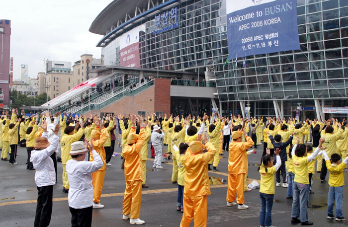 6日凌晨一辆辆车队冒着蒙蒙细雨开往釜山海云台。法轮功学员们在即将召开APEC会议的场地附近的海云台沙滩上排字“法轮大法”。接着集合在釜山火车站广场,宣读声明书,整装街头游行。当大法音乐回响在釜山火车站上空时,突然几百只鸽子腾空而起,高高飞翔 ……