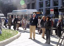 地处白宫附近的Farragut Square是一个街心花园广场,附近都是各大媒体、联邦政府机构、华府智库的办公大楼,集会正值午休时间,周围的行人如潮,不少人停下来驻足观看法轮功学员在集会现场的反酷刑展,聆听集会发言。