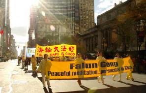 在法轮功的队伍中,除了壮观美好的“法轮大法”和“真善忍”横幅外,还有3个大横幅: