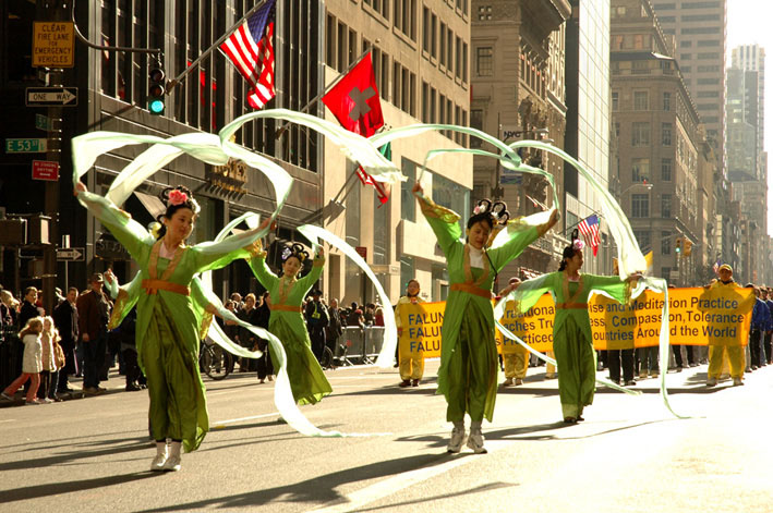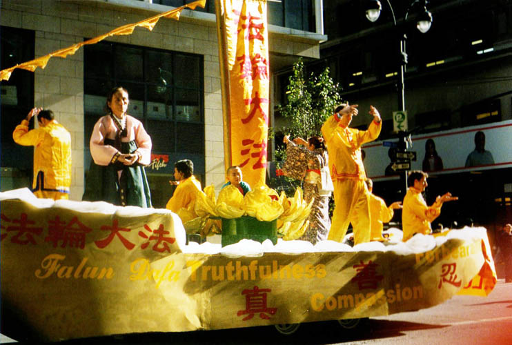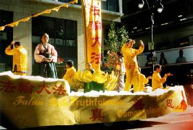 法轮功的花车与众不同,乃是花船。花船的帆“法轮大法”高高悬挂,花船上不同族裔的法轮功修炼者安详专注的进行着功法演示;端坐莲花上的小弟子也是神情超然。花船在5大道上“乘风破浪”,好不威风。后面的功法表演方阵在行进中展示着法轮功舒缓优美的动作,腰鼓队压阵,在“法轮大法好”的音乐中鼓声阵阵,英姿勃发。