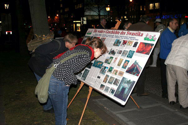 ![]() 过往路人认真阅读法轮功真象图版 |