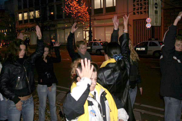 ![]() 一群德国的青年人经过,不约而同模仿着学员站成一排,还跟着学炼功动作 |