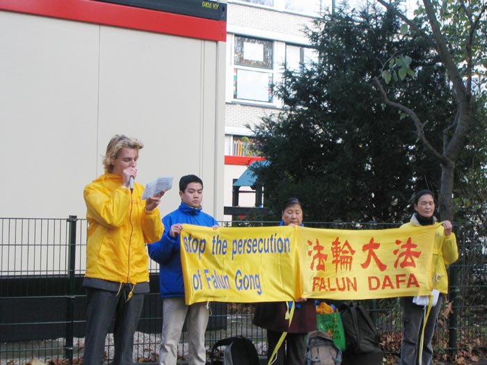 宣读结束后,法轮功学员将《法轮大法学会公告》投递到中国驻荷兰使馆信箱中,希望使馆有关人员能亲自读到《公告》。在递送过程中,一使馆人员冲出来拍照并妄图阻止学员递送公告。这时一直在一旁执行公务的荷兰警察快步走到法轮功学员身边保护学员顺利的将《公告》投進了中使馆的信箱。最后这位警察还与学员握手并祝学员们成功。