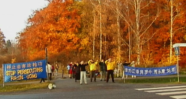 【明慧网2005年11月6日】2005年11月4日下午3时,瑞典首都斯德哥尔摩法轮功学员在中国驻瑞典使馆前,宣读《法轮大法学会公告》。